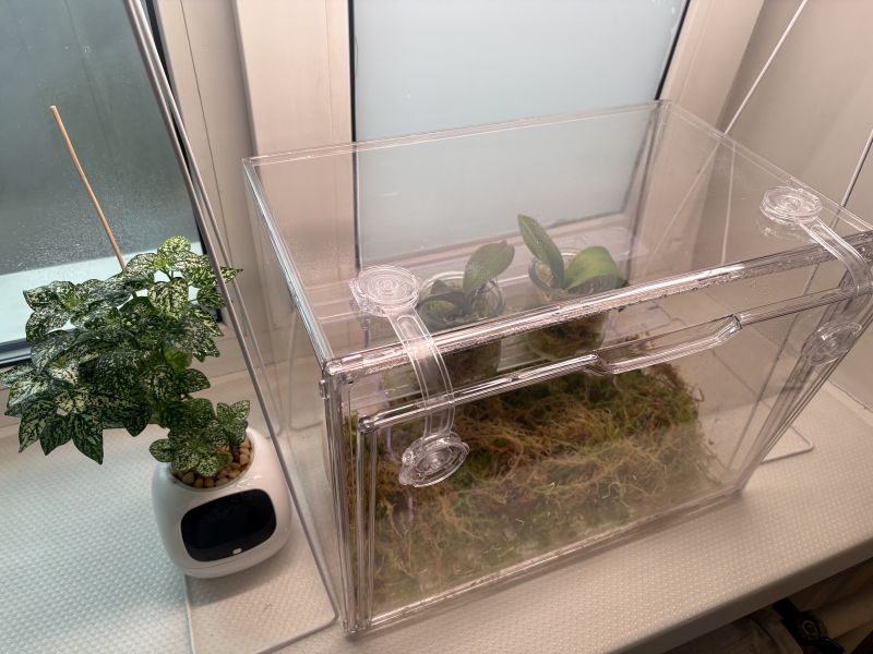 Короче я собрала реанимационный орхидейник. Если они смогут нарастить тут корни, то через пару месяцев высажу их на корягу, а если нет, то не очень-то они и хотели жить