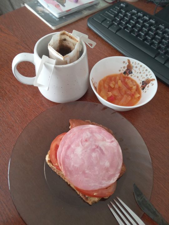 На завтрак: тост с яйцом и сливками, помидор и кусочек балыка (в тарелке рядом тушеные болгарские перцы в томате) и кофе в дрипах. Где-то на столе лежит конфета в качестве десерта хд