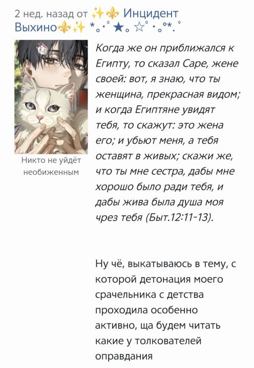 Короче рассказываю, оправданий на самом деле не было, поступок что Авраама что Иакова был кринжем и Бог этого не отрицал, Иакову вообще ребрендинг оформили в тот момент, когда он перестал крысить (а он буквально пытался подставить фараона по схеме деда) и начал ровно себя вести, типа буквально Бог всю дорогу просто пытается выбрать меньшее из говн, типа, ну обоссался и обоссался, а хуле поделать, ну все мы не без греха.