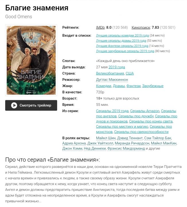 Штож, наконец-то я добрался до второго сезона данного сериала, хотя оттягивал этот момент довольно долгое время. Завидую Азерафелю из-за того, что рядом с ним всегда был такой Кроули. И сочуствую Кроули, что у него такая тугодумная булка. Второй сезон слишком зациклен на отношениях, но мне понравились путешествия в их памяти в разные годы их жизни и взаимодействия. Надеюсь когда нибудь доберусь до книг эхь. Ну а пока что ждемсь последний фильм вместо третьего сезона, чертовски жаль что сереал закрыли(((