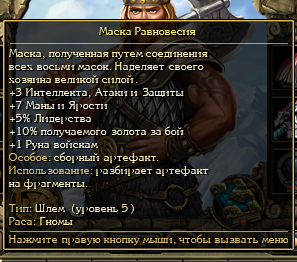 По итогу что? Правильно. Маска равновесия оказалась реально бис слотом. +3 атаки, защиты и интеллекта уже ставят ее на голову выше любого другого слота шлема. Это 9 статов в сумме, а ведь кроме этого там процентное лидерство, ярость, мана +золото (что уже не особо важно у меня 10 лямов голды) и, что самое интересное и приятное, +1 руна войскам. Руны очень сильный буст, особенно руна удачи которая позволяет походить дважды за раунд отряду
