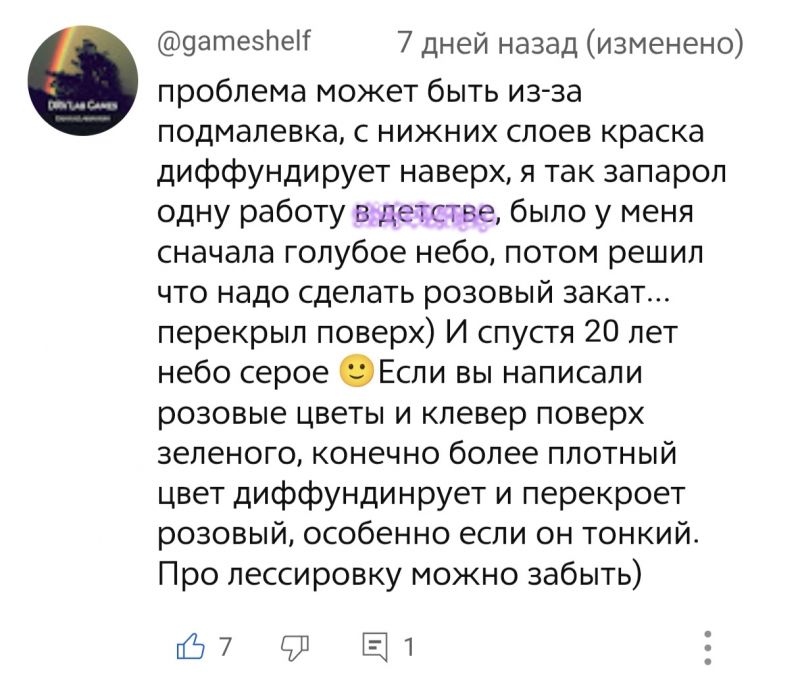 Ну вот преимущество маслоёбов перед комьюнити акварелисток в том, что помимо тупых девок, которые ужаснулись проёбанному цвету, в половине комментариев хуёв за шиворот челу накидал за нарушение базовой технологии живописи и я считаю полностью правы