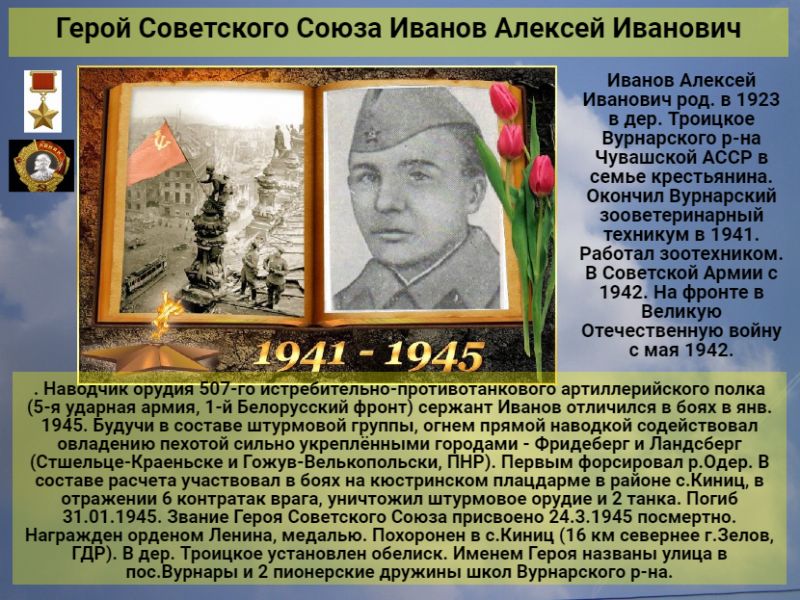 Иванов Алексей Иванович род. в 1923 в дер. Троицкое Вурнарского р-на Чувашской АССР в семье крестьянина. Окончил Вурнарский зооветеринарный техникум в 1941. Работал зоотехником. В Советской Армии с 1942. На фронте в Великую Отечественную войну с мая 1942. Наводчик орудия 507-го истребительно-противотанкового артиллерийского полка (5-я ударная армия, 1-й Белорусский фронт) сержант Иванов отличился в боях в янв. 1945. Будучи в составе штурмовой группы, огнем прямой наводкой содействовал овладению пехотой сильно укреплёнными городами - Фридеберг и Ландсберг (Стшельце-Краеньске и Гожув-Велькопольски, ПНР). Первым форсировал р.Одер. В составе расчета участвовал в боях на кюстринском плацдарме в районе с.Киниц, в отражении 6 контратак врага, уничтожил штурмовое орудие и 2 танка. Погиб 31.01.1945. Звание Героя Советского Союза присвоено 24.3.1945 посмертно. Награжден орденом Ленина, медалью. Похоронен в с.Киниц (16 км севернее г.Зелов, ГДР). В дер. Троицкое установлен обелиск. Именем Героя названы улица в пос.Вурнары и 2 пионерские дружины школ Вурнарского р-на.