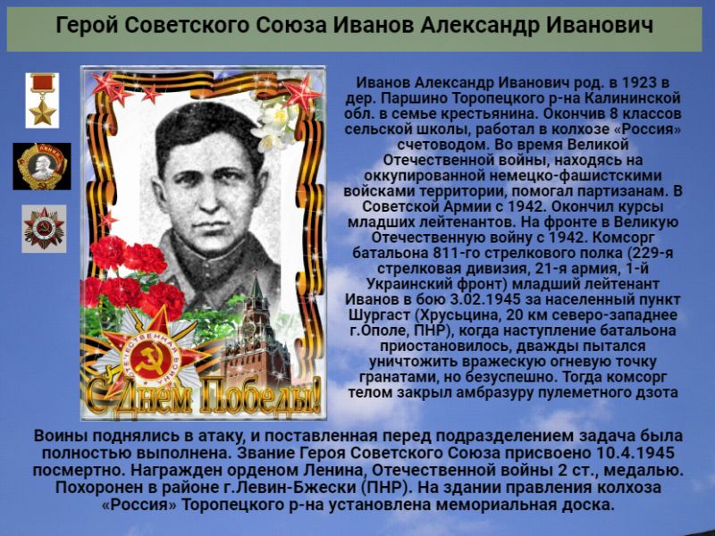 Иванов Александр Иванович род. в 1923 в дер. Паршино Торопецкого р-на Калининской обл. в семье крестьянина. Окончив 8 классов сельской школы, работал в колхозе «Россия» счетоводом. Во время Великой Отечественной войны, находясь на оккупированной немецко-фашистскими войсками территории, помогал партизанам. В Советской Армии с 1942. Окончил курсы младших лейтенантов. На фронте в Великую Отечественную войну с 1942. Комсорг батальона 811-го стрелкового полка (229-я стрелковая дивизия, 21-я армия, 1-й ский фронт) младший лейтенант Иванов в бою 3.02.1945 за населенный пункт Шургаст (Хрусьцина, 20 км северо-западнее г.Ополе, ПНР), когда наступление батальона приостановилось, дважды пытался уничтожить вражескую огневую точку гранатами, но безуспешно. Тогда комсорг телом закрыл амбразуру пулеметного дзота. Воины поднялись в атаку, и поставленная перед подразделением задача была полностью выполнена. Звание Героя Советского Союза присвоено 10.4.1945 посмертно. Награжден орденом Ленина, Отечественной войны 2 ст., медалью. Похоронен в районе г.Левин-Бжески (ПНР). На здании правления колхоза «Россия» Торопецкого р-на установлена мемориальная доска.