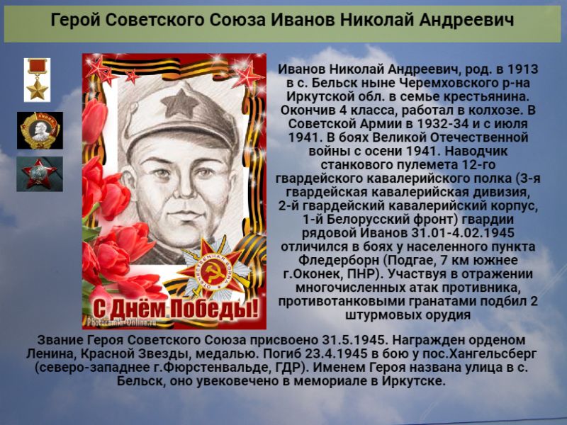 Иванов Николай Андреевич род. в 1913 в с. Бельск ныне Черемховского р-на Иркутской обл. в семье крестьянина. Окончив 4 класса, работал в колхозе. В Советской Армии в 1932-34 и с июля 1941. В боях Великой Отечественной войны с осени 1941. Наводчик станкового пулемета 12-го гвардейского кавалерийского полка (3-я гвардейская кавалерийская дивизия, 2-й гвардейский кавалерийский корпус, 1-й Белорусский фронт) гвардии рядовой Иванов 31.01-4.02.1945 отличился в боях у населенного пункта Фледерборн (Подгае, 7 км южнее г.Оконек, ПНР). Участвуя в отражении многочисленных атак противника, противотанковыми гранатами подбил 2 штурмовых орудия. Звание Героя Советского Союза присвоено 31.5.1945. Награжден орденом Ленина, Красной Звезды, медалью. Погиб 23.4.1945 в бою у пос.Хангельсберг (северо-западнее г.Фюрстенвальде, ГДР). Именем Героя названа улица в с. Бельск, оно увековечено в мемориале в Иркутске.