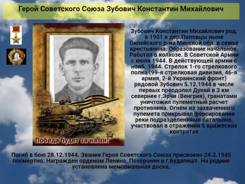 Зубович Константин Михайлович род. в 1901 в дер.Поповцы ныне Вилейского р-на Минской обл. в семье крестьянина. Образование начальное. Работал в колхозе. В Советской Армии с июля 1944. В действующей армии с нояб. 1944. Стрелок 1-го стрелкового полка (99-я стрелковая дивизия, 46-я армия, 2-й ский фронт) рядовой Зубович 5.12.1944 в числе первых преодолел Дунай в 3 км севернее г.Эрчи (Венгрия), гранатами уничтожил пулеметный расчет противника. Огнём из захваченного пулемета прикрывал форсирование реки подразделениями батальона, участвовал в отражении 5 вражеских контратак. Погиб в бою 28.12.1944. Звание Героя Советского Союза присвоено 24.3.1945 посмертно. Награжден орденом Ленина. Похоронен в г.Будапешт. На родине установлена мемориальная доска.
