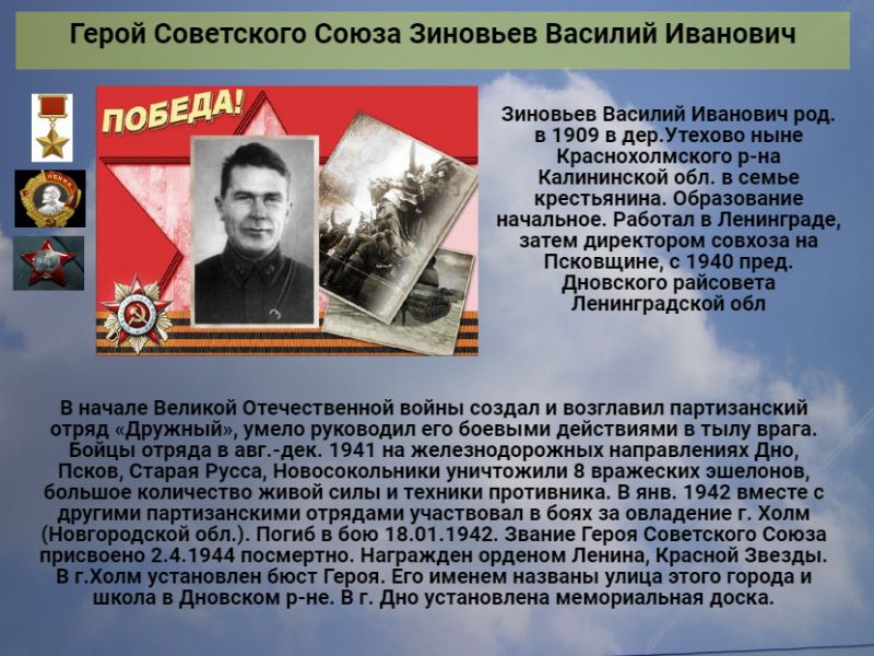 Зиновьев Василий Иванович род. в 1909 в дер.Утехово ныне Краснохолмского р-на Калининской обл. в семье крестьянина. Образование начальное. Работал в Ленинграде, затем директором совхоза на Псковщине, с 1940 пред. Дновского райсовета Ленинградской обл. В начале Великой Отечественной войны создал и возглавил партизанский отряд «Дружный», умело руководил его боевыми действиями в тылу врага. Бойцы отряда в авг.-дек. 1941 на железнодорожных направлениях Дно, Псков, Старая Русса, Новосокольники уничтожили 8 вражеских эшелонов, большое количество живой силы и техники противника. В янв. 1942 вместе с другими партизанскими отрядами участвовал в боях за овладение г. Холм (Новгородской обл.). Погиб в бою 18.01.1942. Звание Героя Советского Союза присвоено 2.4.1944 посмертно. Награжден орденом Ленина, Красной Звезды. В г.Холм установлен бюст Героя. Его именем названы улица этого города и школа в Дновском р-не. В г. Дно установлена мемориальная доска.